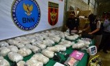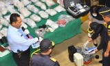Petugas menunjukkan barang bukti berupa Ratusan Kilogram Sabu saat konefrensi Pers penggerebekan gudang Narkoba di Desa Pekalongan, Batealit, Jepara, Jawa Tengah, Kamis (28/1). (Antara/Yusuf Nugroho) (FOTO : Antara/Yusuf Nugroho)