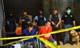 Petugas menunjukkan dua tersangka pengedar narkoba saat penggerebekan gudang narkoba di Desa Pekalongan, Batealit, Jepara, Jawa Tengah, Kamis (28/1). (Antara/Yusuf Nugroho) (FOTO : Antara/Yusuf Nugroho)