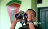 Petugas Pengamanan Perbatasan Indonesia-Malaysia Pos Saparan melihat kondisi kawasan dengan teropong di kawasan Saparan, Bengkayang, Kalimantan Barat, Kamis (28/1). (Republika/Wihdan)