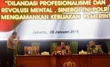 Presiden Joko Widodo (kanan) memberikan arahan saat memimpin Rapim TNI-POLRI di Gedung PTIK Polri, Jakarta, Jumat (29/1). (Antara/Yudhi Mahatma)