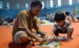 Tim Dukungan Psikososial Kemensos bermain dengan anak-anak pengungsi eks-Gafatar di Gedung Pusat Olahraga Persahabatan Korea Indonesia (POPKI), Cibubur, Jakarta Timur, Jumat (29/1). (Republika/Yasin Habibi)