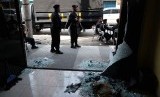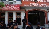 Personel Brimob berjaga di depan kantor organisasi kepemudaan (OKP) pasca bentrok, di Medan, Sumatera Utara, Ahad (31/1). (Antara//Irsan Mulyadi)