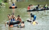 Sejumlah anak bermain Kukuyaan di Sungai Cikapundung kawasan Teras Cikapundung, Jalan Siliwangi, Kota Bandung, Ahad (31/1). (Republika/Edi Yusuf)