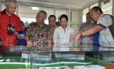 Menteri PUPR, Basuki Hadimuljono. Menteri BUMN, Rini Soemarno; Gubernur Jawa Tengah, Ganjar Pranowo melihat maket rusunawa di Kelurahan Gedanganak, Kecamatan Ungaran Timur, Kabupaten Semarang, Ahad (7/2). (Republika/Bowo Pribadi)