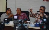 Mantan Pimpinan KPK Bambang Widjojanto (tengah) memberikan pemaparannya dalam diskusi Revisi UU KPK dan Pertaruhan Modal Politik Jokowi di Jakarta, Senin (8/2).(Republika/Raisan Al Farisi)