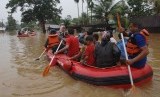 Warga diungsikan menggunakan perahu karet saat banjir merendam Nagari Pangkalan, Kabupaten Limapuluhkota, Sumatera Barat, Senin (8/2). (Antara/Iggoy el Fitra)