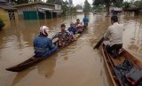 Warga diungsikan menggunakan perahu tradisional saat banjir merendam Nagari Pangkalan, Kabupaten Limapuluhkota, Sumatera Barat, Senin (8/2). (Antara/Iggoy el Fitra)