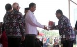 Presiden RI Joko Widodo menerima buku dari Ketua Umum PWI Pusat Margiono (kanan) pada acara puncak Peringatan Hari Pers Nasional (HPN) 2016 di Mandalika, Nusa Tenggara Barat, Selasa (9/2). (Republika/Rakhmawaty La’lang)
