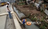 Petugas melakukan penyedotan air dengan menggunakan mobil pompa di pinggiran proyek revitalisasi Ciliwung, Kampung Pulo, Jakarta, Kamis (11/2). (Republika/Yasin Habibi) (FOTO : Republika/ Yasin Habibi)