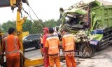 REPUBLIKA.CO.ID, CIKAMPEK -- Petugas derek PT Jasa Marga mengevakuasi sebuah truk pengangkut pasir di Jalan Tol Cikampek-Jakarta Km 40 arah Cikampek, Jumat (12/2) pagi.