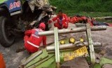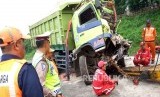 Petugas derek PT Jasa Marga mengevakuasi truk pengangkut pasir di Tol Cikampek-Jakarta Km 40 arah Cikampek, Jumat (12/2). (Republika/Yogi Ardhi) (FOTO : Republika/Yogi Ardhi)