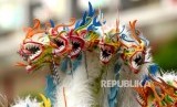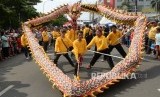 Atraksi liong menghibur warga yang menyaksikan karnaval perayaan Cap Go Meh di Kawasan Glodok, Jakarta Pusat, Ahad (21/2).Republika/Wihdan Hidayat (FOTO : Republika/Wihdan Hidayat)