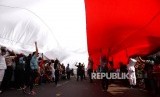 Bendera merah putih berukuran besar diarak saat karnaval perayaan Cap Go Meh di Kawasan Glodok, Jakarta Pusat, Ahad (21/2).Republika/Wihdan Hidayat (FOTO : Republika/Wihdan Hidayat)