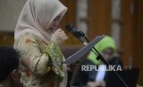 Terdakwa kasus korupsi dana bansos di Sumatera Utara (Sumut), Istri Gubernur Sumut nonaktif Gatot Pujo Nugroho, Evy Susanti menangis saat membacakan pembelaan dalam sidang lanjutan dengan agenda pembelaan di Pengadilan Tipikor, Jakarta, Rabu (24/2). (FOTO : Republika/Raisan Al Farisi)