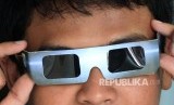 Pengunjung mencoba kacamata dan teleskop untuk melihat gerhana matahari di Planetarium dan Observatorium, Taman Ismail Marzuki (TIM), Jakarta, Senin (7/3). (Republika/Yasin Habibi) (FOTO : Republika/Yasin Habibi)