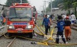 Petugas pemadam kebakaran dibantu warga memadamkan sisa api yang membakar permukiman di pinggiran rel kereta api kawasan Pesing Koneng, Kebon Jeruk, Jakarta Barat, Kamis (10/3). (FOTO : Republika/Yasin Habibi)