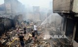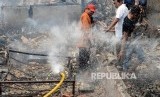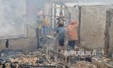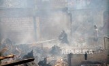 REPUBLIKA.CO.ID,JAKARTA -- Petugas pemadam kebakaran dibantu warga memadamkan sisa api yang membakar permukiman di pinggiran rel kereta api kawasan Pesing Koneng, Kebon Jeruk, Jakarta Barat, Kamis (10/3).
