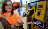 Karyawan menunjukan kartu e-toll usai Launching e-Payment Toll di Pintu Gerbang tol Jati Asih, Jakarta, Senin (21/3). (Republika/Prayogi) (FOTO : Republika/ Prayogi)