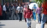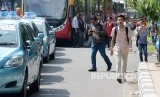 REPUBLIKA.CO.ID,JAKARTA -- Warga terpaksa berjalan kaki saat ribuan sopir taksi dan angkutan umum lain melakukan aksi unjuk rasa di Jakarta, Selasa (22/3).