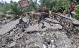 Seorang warga berjalan di jalan raya yang amblas di lokasi bencana longsor di Desa Clapar, Madukara, Banjarnegara, Jateng, Rabu (30/3). (Antara/Anis Efizudin)