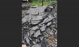 Seorang wartawan memotret jalan raya yang amblas di lokasi bencana longsor di Desa Clapar, Madukara, Banjarnegara, Jateng, Rabu (30/3). (Antara/Anis Efizudin)