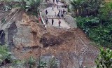 REPUBLIKA.CO.ID, BANJARNEGARA -- Sejumlah warga menyaksikan jalan raya yang amblas di lokasi bencana longsor di Desa Clapar, Madukara, Banjarnegara, Jateng, Rabu (30/3).