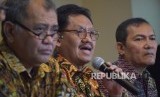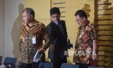 Ketua KPK Agus Rahardjo (kiri) bersama Jamintel Kejagung Adi Toegarisman (kanan) dan Pimpinan KPK Laode Muhammad Syarif (tengah) memberikan keterangan OTT dugaan suap Kejaksaan Tinggi DKI Jakarta, Jumat (1/4).(Republika/Rakhmawaty La'lang)