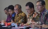 Ketua KPK Agus Rahardjo (tengah) bersama Jamintel Kejagung Adi Toegarisman (kedua kanan) dan jajaran Pimpinan KPK memberikan keterangan OTT dugaan suap Kejaksaan Tinggi DKI Jakarta, Jumat (1/4).(Republika/Rakhmawaty La'lang)