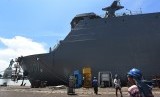 REPUBLIKA.CO.ID,SURABAYA -- Pekerja menyelesaikan pembuatan kapal perang Strategic Sealift Vessel (SSV)-1 pesanan Filipina di galangan PT PAL, Surabaya, Jawa Timur, Senin (4/4).