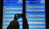 Calon penumpang memotret jadwal keberangkatan dan kedatangan pesawat di Bandara Halim Perdanakusuma, Jakarta, Senin (4/4) malam. (Republika/Raisan Al Farisi) (FOTO : Republika/Raisan Al Farisi)