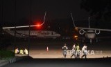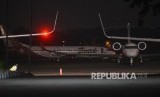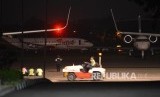 Pesawat Batik Air dengan nomor registrasi PK-LBS (belakang) dipindahkan oleh petugas di Bandara Halim Perdanakusuma, Jakarta, Senin (4/4) malam. (Republika/Raisan Al Farisi)