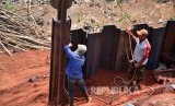 REPUBLIKA.CO.ID, JAKARTA -- Para pekerja mengerjakan perbaikan jalan yang longsor beberapa waktu lalu akibat hujan lebat di Jalan Gardu, Jagakarsa, Selasa (5/4).