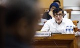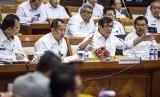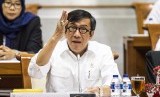 REPUBLIKA.CO.ID, JAKARTA -- Menteri Hukum dan HAM Yasonna Laoly menyampaikan pandangannya saat mengikuti Rapat Kerja dengan Komisi III DPR RI di Kompleks Parlemen, Jakarta, Senin (11/4).