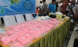 REPUBLIKA.CO.ID, MEDAN -- Sejumlah tersangka kepemilikan narkoba dihadirkan saat gelar kasus oleh Badan Narkotika Nasional (BNN) di Medan, Sumatra Utara, Senin (11/4).