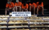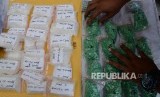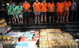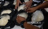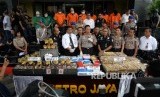 REPUBLIKA.CO.ID, JAKARTA -- Barang bukti dan tersangka ditunjukkan saat konferensi pers penyelundupan narkotika hasil operasi bersinar 2016 di Polda Metro Jaya, Jakarta, Rabu (13/4). \