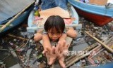 Sejumlah anak korban bongkaran pemukiman warga kawasan Pasar Ikan, bermain di pantai kawasan Penjaringan, Jakarta Utara, Jumat (15/4). (Republika/ Raisan Al Farisi) (FOTO : Republika/Raisan Al Farisi)