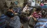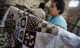 Sejumlah pengrajin batik mencanting lilin (malam) ke atas kain di salah satu rumah di Centra Batik Tulis Trusmi, Desa Trusmi Wetan, Plered, Cirebon, Jawa Barat, Sabtu (16/4).(Antara/Widodo S. Jusuf) (FOTO : Antara/ Widodo S. Jusuf)