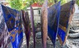 Seorang pengrajin batik menjemur kain batik usai diwarnai di salah satu rumah di Centra Batik Tulis Trusmi, Desa Trusmi Wetan, Plered, Cirebon, Jawa Barat, Sabtu (16/4). (Antara/Widodo S. Jusuf) (FOTO : Antara/ Widodo S. Jusuf)