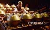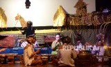 Nayaga memainkan alat musik tradisional dalam pentas wayang kulit Indramayu lakon 'Hanoman Duta' Ki Dalang Dian Pradita Kusuma dari Satria Langen Budaya, Kabupaten Indramayu, Jawa Barat, di GK Rumentang Siang, Kota Bandung, Sabtu (16/4) malam. (Republika/E