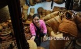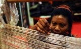 Pengrajin menyelesaikan pembuatan tenun ikat khas Flores pada pameran Inacraft 2016 di JCC, Jakarta, Rabu (20/4). (Republika/Tahta Aidilla ) (FOTO : Republika/ Tahta Aidilla)