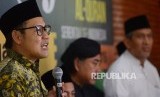 Ketua Umum Partai Kebangkitan Bangsa Muhaimin Iskandar memberikan keterangan kepada media terkait Nusantara Mengaji saat menggelar konferensi pers di Ciganjur, Jakarta Selatan, Jumat (6/5).(Republika/Raisan Al Farisi) (FOTO : Republika/Raisan Al Farisi)