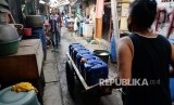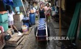 Warga membawa gerobak air bersih di Kampung Luar Batang, Jakarta Utara, Senin (9/5). (Republika/Yasin Habibi) (FOTO : Republika/ Yasin Habibi)