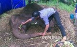 Keeper memberi makan kepada Yani, gajah Lampung di Kebun Binatang milik Yayasan Margasatwa Tamansari Bandung, Rabu (11/5). (Foto : Dede Lukman Hakim) (FOTO : Republika/Dede Lukman Hakim)