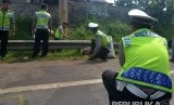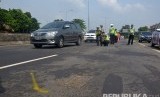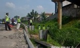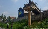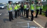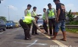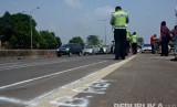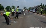 Pasca terjadinya Jembatan Penyeberangan Orang (JPO) yang dihantam oleh truk yang membawa muatan crane, Polisi melakukan olah Tempat Kejadian Perkara (TKP) yang berada di depan Rest Area km 7+200, tol Jakarta-Serpong, Selasa (17/5). (foto : MgROL_45) (FOTO : foto : MgROL_45)