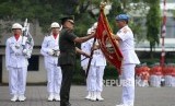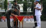 Panglima TNI Jenderal Gatot Nurmantyo menyerahkan bendera Pataka Setia Waspada kepada Komandan Paspampres Brigjen TNI (Mar) Bambang Suswantono di Markas Komando Paspampres, Tanah Abang, Jakarta, Rabu (25/5).(Republika/Wihdan) (FOTO : Republika/ Wihdan)