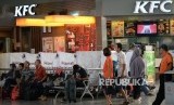 Sejumlah gerai cepat saji di Stasiun Gambir Jakarta, Senin (6/6), menutup toko mereka dengan tirai untuk menghormati umat Muslim yang menjalankan ibadah puasa. (Republika/Wihdan)