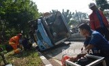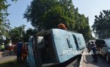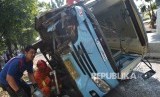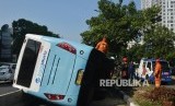 REPUBLIKA.CO.ID, JAKARTA -- Sebuah bus Transjakarta mengalami kecelakaan tunggal di Jalan Warung Buncit, Jakarta Selatan, Selasa (7/6). Bus tersebut terbalik di depan gedung Inti Fauzi, Jalan Warung Buncit Raya, sekitar pukul 08.33 WIB.