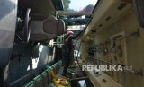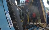 Petugas kepolisian dibantu oleh petugas pemadam kebakaran mengevakuasi bangkai bus Transjakarta yang terbalik saat mengalami kecelakaan di Jalan Warung Buncit, Jakarata Selatan, Rabu (7/6). (Republika/Raisan Al Farisi) (FOTO : Republika/Raisan Al Farisi)
