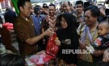 Menteri Perdagangan Thomas Lembong (kiri) berbincang dengan pembeli saat inspeksi mendadak di PD Pasar Jaya, Kramat Jati, Jakarta, Jumat (10/6). (Republika/Tahta Aidilla) (FOTO : Republika/Tahta Aidilla)