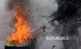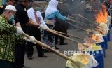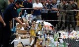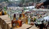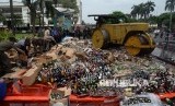 REPUBLIKA.CO.ID, JAKARTA -- Petugas mengoperasikan alat berat memusnahkan ribuan minuman keras ilegal pada acara pemusnahan barang ilegal di Kantor Pusat Bea dan Cukai, Jakarta, Senin (20/6). Bea dan Cukai memusnahkan berbagai merek minuman keras impor ilegal, pita cukai MMEA impor palsu, handphone, serta hasil tembakau dengan total barang senilai Rp.46 Miliar.